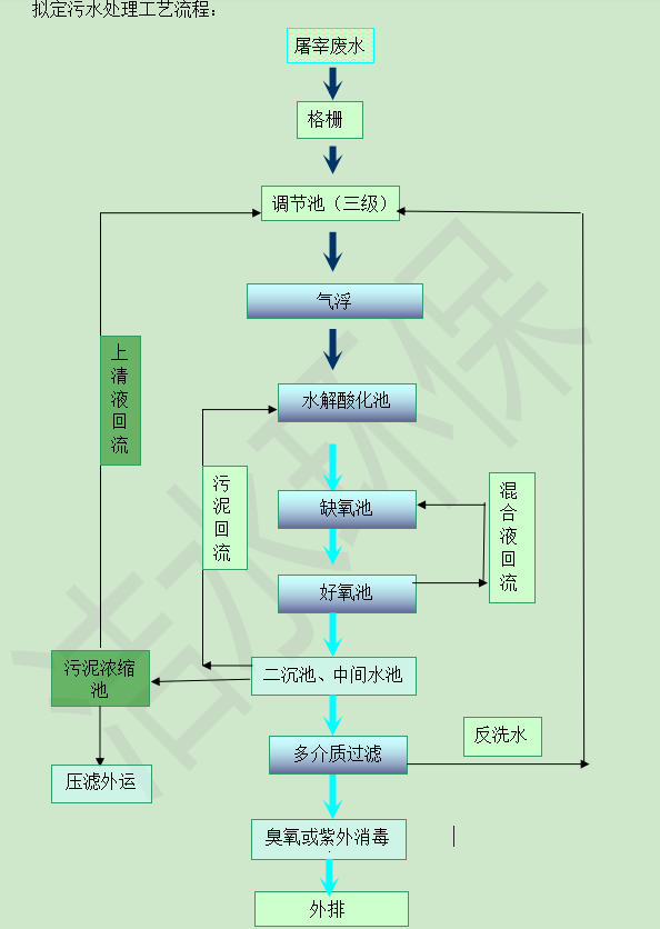 根據廢水特點及處理出水要求,該廢水處理工藝采用物化+生化處理工藝是必需的。廢水CODcr與色度較高,廢水中油脂濃度超過40mg/l時,油脂粘附于生物膜表面,阻斷廢水與生物膜的接觸,使生化去除效率下降;廢水中含有的大量豬毛、肉屑、骨屑、內臟雜物、未消化的食化和糞便等也不易生化,因此該廢水必需采取必要的預處理及物化處理,盡量降低進入生物處理構筑物的懸浮物和油脂含量,再進行生化處理,確保生化處理的正常運行。屠宰廢水除了濃度高,色度高外,還有胺氮,總磷超標比較難處理,因此在設計過程中應該考慮到它們的去除。